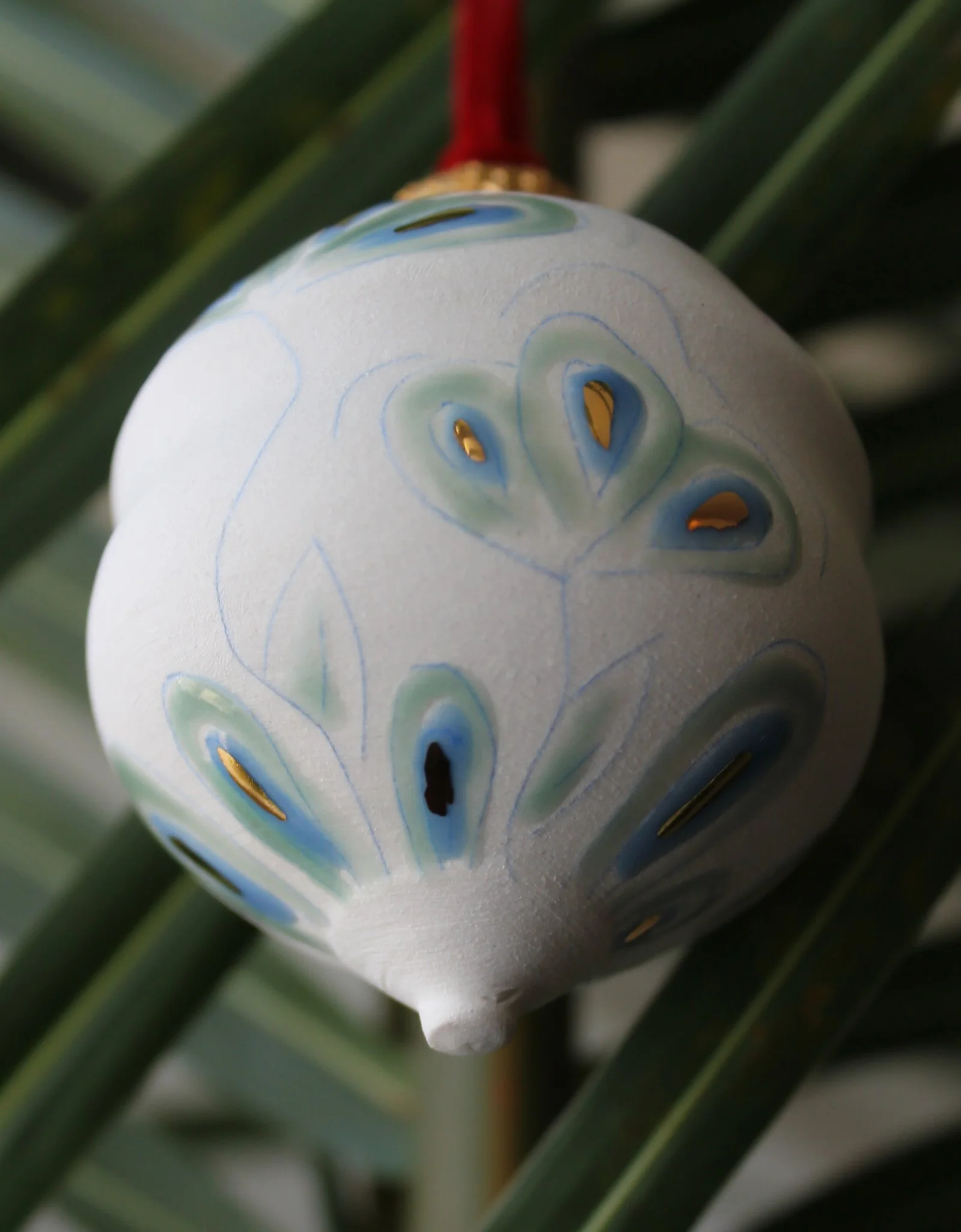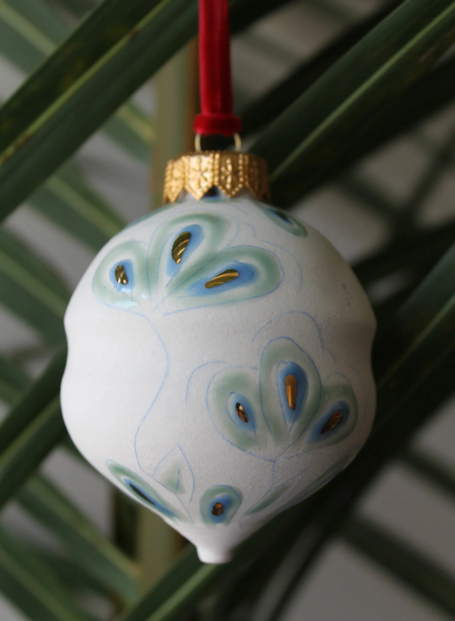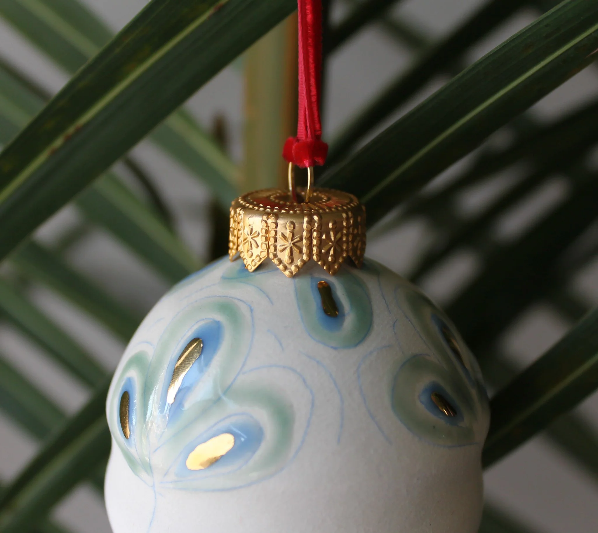 Elevate your holiday decor with our handcrafted, wheel-thrown porcelain heirloom ornaments. Featuring a unique retro-inspired design, hand-carved and inlaid with rich cobalt blue. Finished with a sky blue celadon glaze, accented by gold luster details, and adorned with a designer gold hoop and velvet red string.
