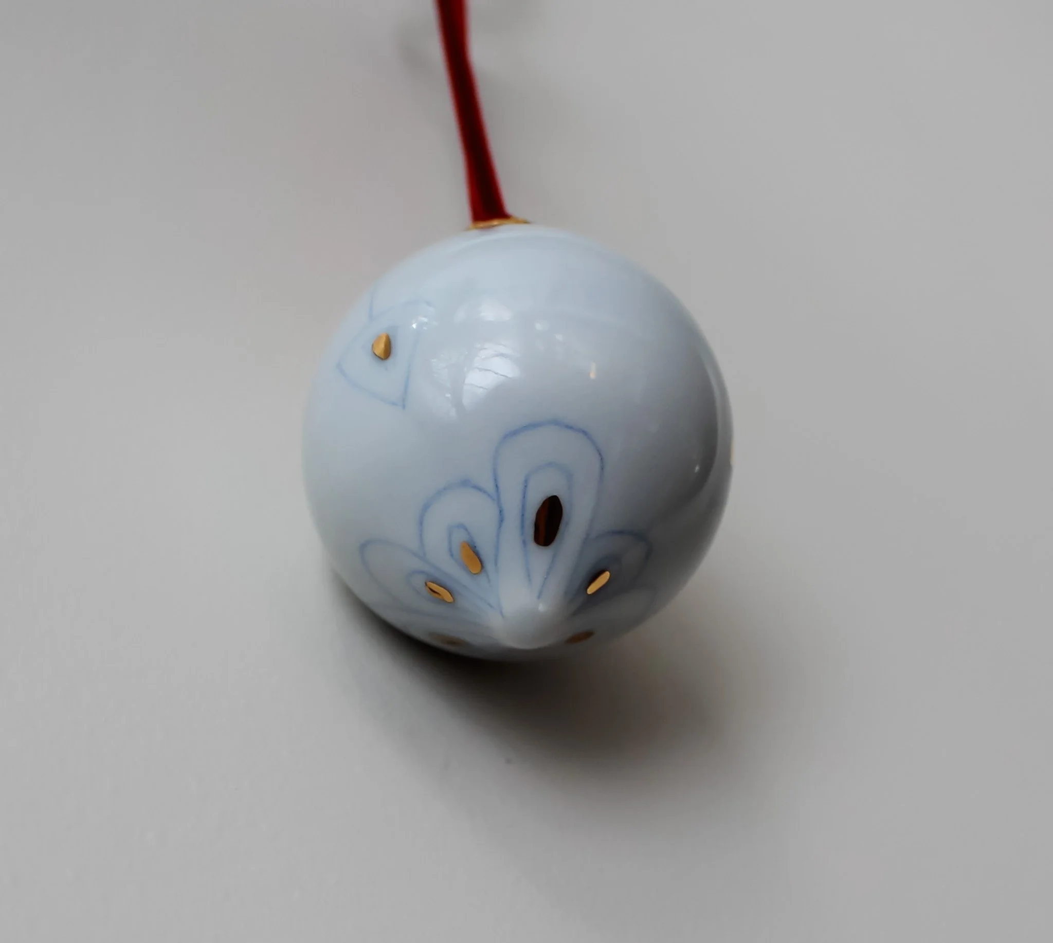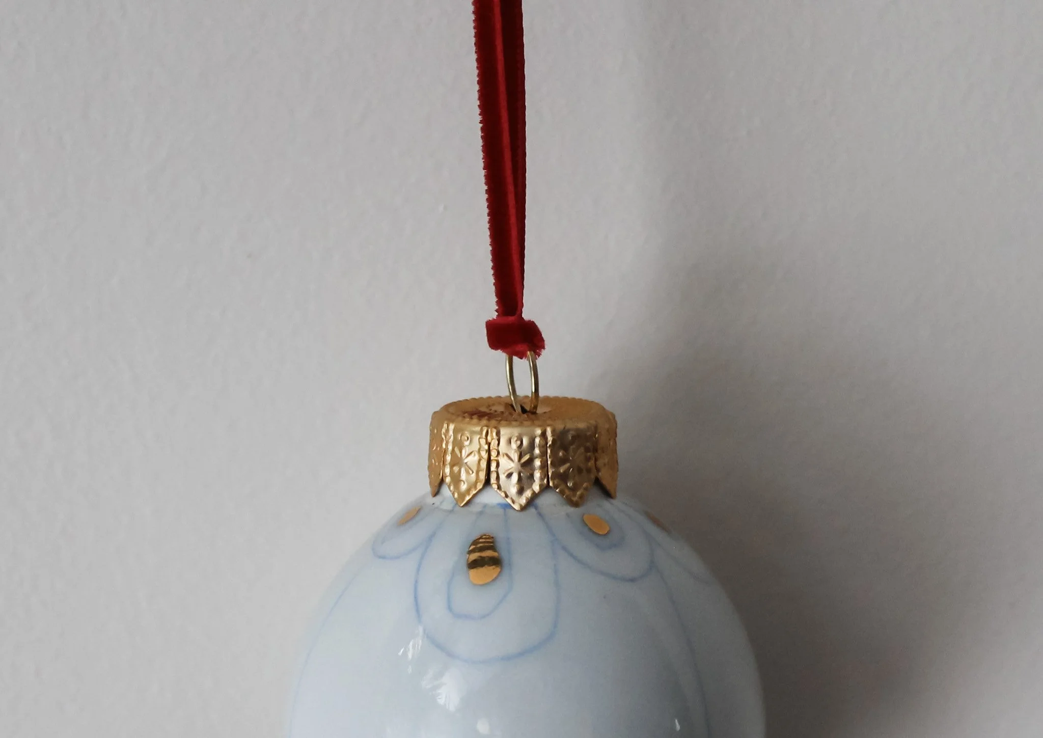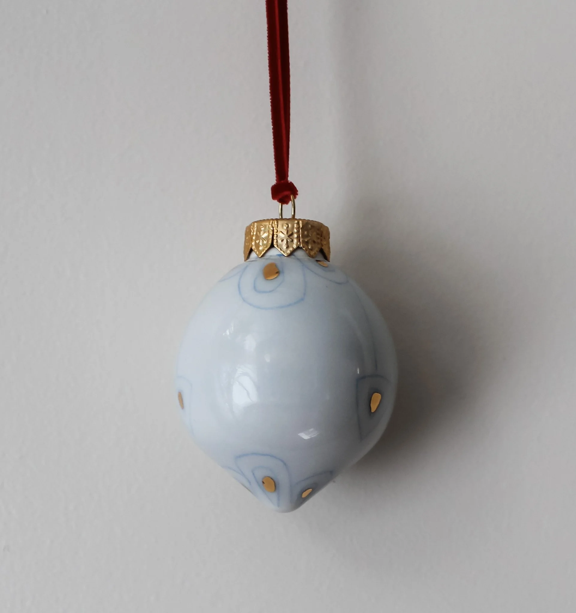 Wheel-thrown, porcelain, heirloom ornaments. Finished with a retro hand-carved design inlaid with cobalt blue and glazed with a subtly light translucent blue celadon. Fashioned with a designer gold hoop and elegant velvet red string.